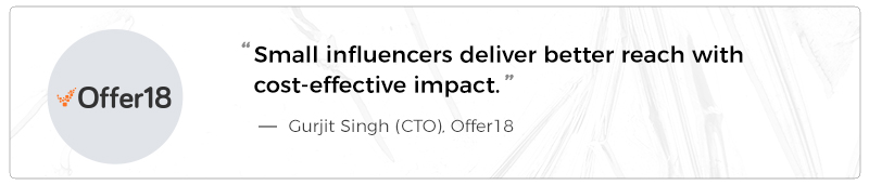 “Several large Influencers of repute charge a hefty sum to their brands for promoting their products and services, and are considered more exacting and must be played down. On the other hand, small influencers seem to be a more favourable option for increasing brand awareness and driving more traffic to the brand. They are a more cost-effective option for expanding a brand’s reach to specialized niche communities, which, in turn, are considered its loyal customers. This gives rise to more involved affiliate marketing where the reviews and recommendations endorsed by these influencers carry more influence than larger influencers,” says Gurjit Singh, CTO at Offer18
