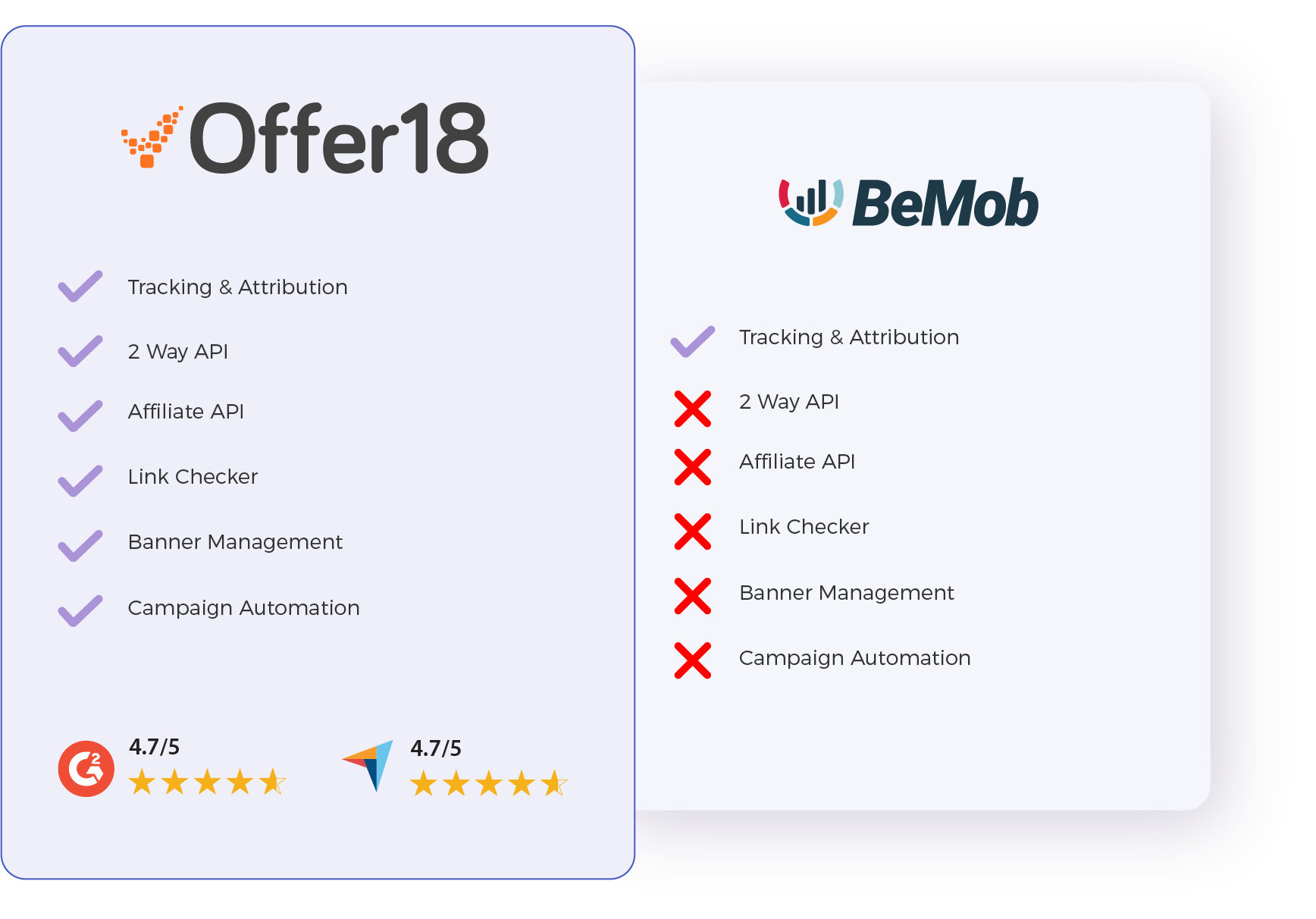 ? While comparing Bemob vs Offer18, the latter tends to emphasize Affiliate and advertiser management, automatic offer syncing, coupon tracking, and commission automation. With this, the Offer18 platform stands tall compared to Bemob, giving it a definitive competitive edge.
