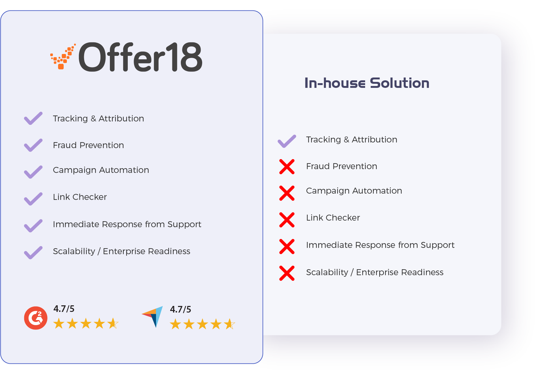 An in-house tracking system often takes months to build, test, and maintain before it delivers value. Offer18, on the other hand, enables instant deployment with a stable infrastructure, no server maintenance, and immediate access to advanced automation and real-time reporting features.